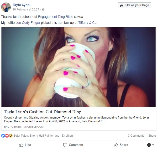 Country singer and Stealing Angels’ member, Tayla Lynn flashes a stunning diamond ring from her boyfriend, John Finger. The couple tied the knot on April 6, 2012 in Anacapri, Italy.